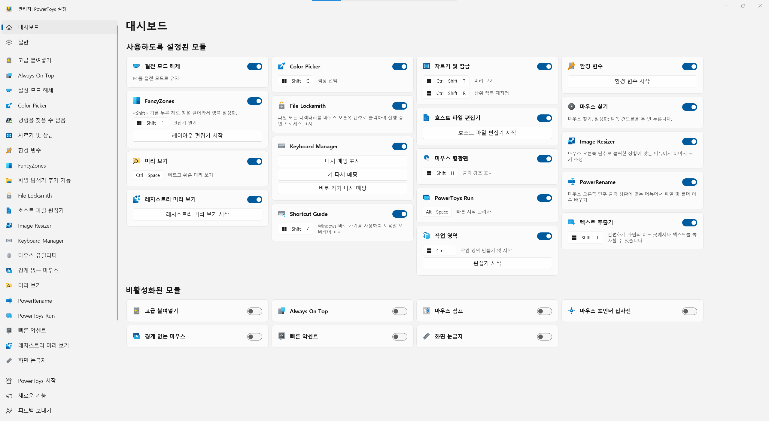 # PowerToy 기능 설정하기
