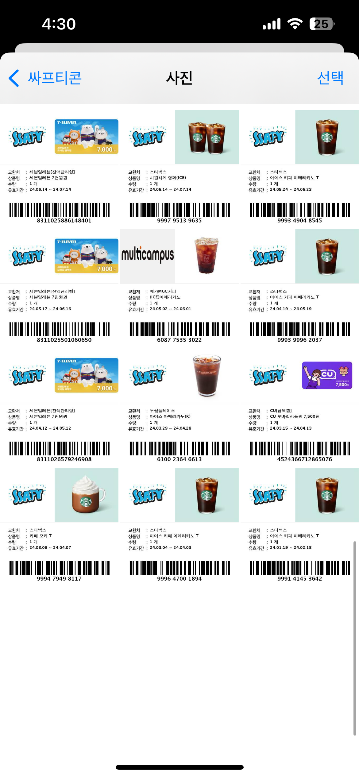 싸피에서 활동을 열심히 하면 기프티콘을 주는데 우리끼리는 이걸 싸프티콘이라고 부른다. 활동을 많이 해서 그런지 27개나 받았다.
